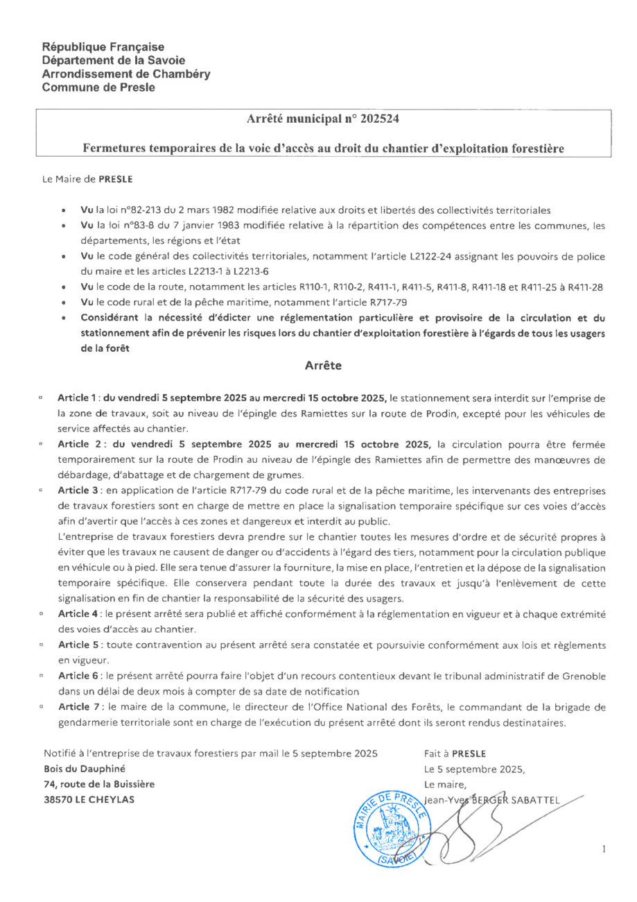 Des travaux forestiers seront réalisés à Prodin du vendredi 5 septembre au mercredi 15 octobre.