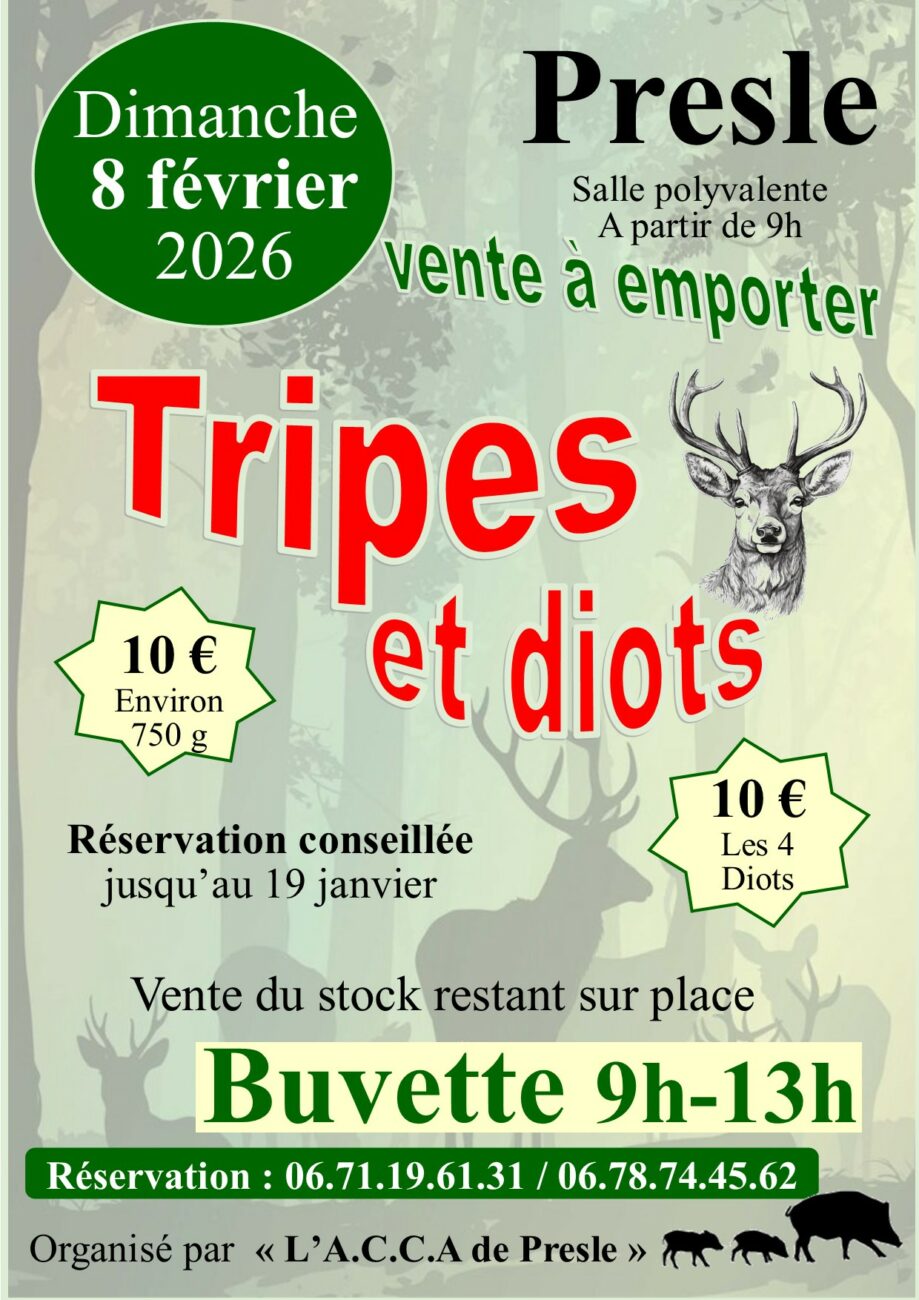 L’A.C.C.A. de Presle organise une vente de tripes et de diots à emporter, dimanche 8 février à la salle polyvalente.